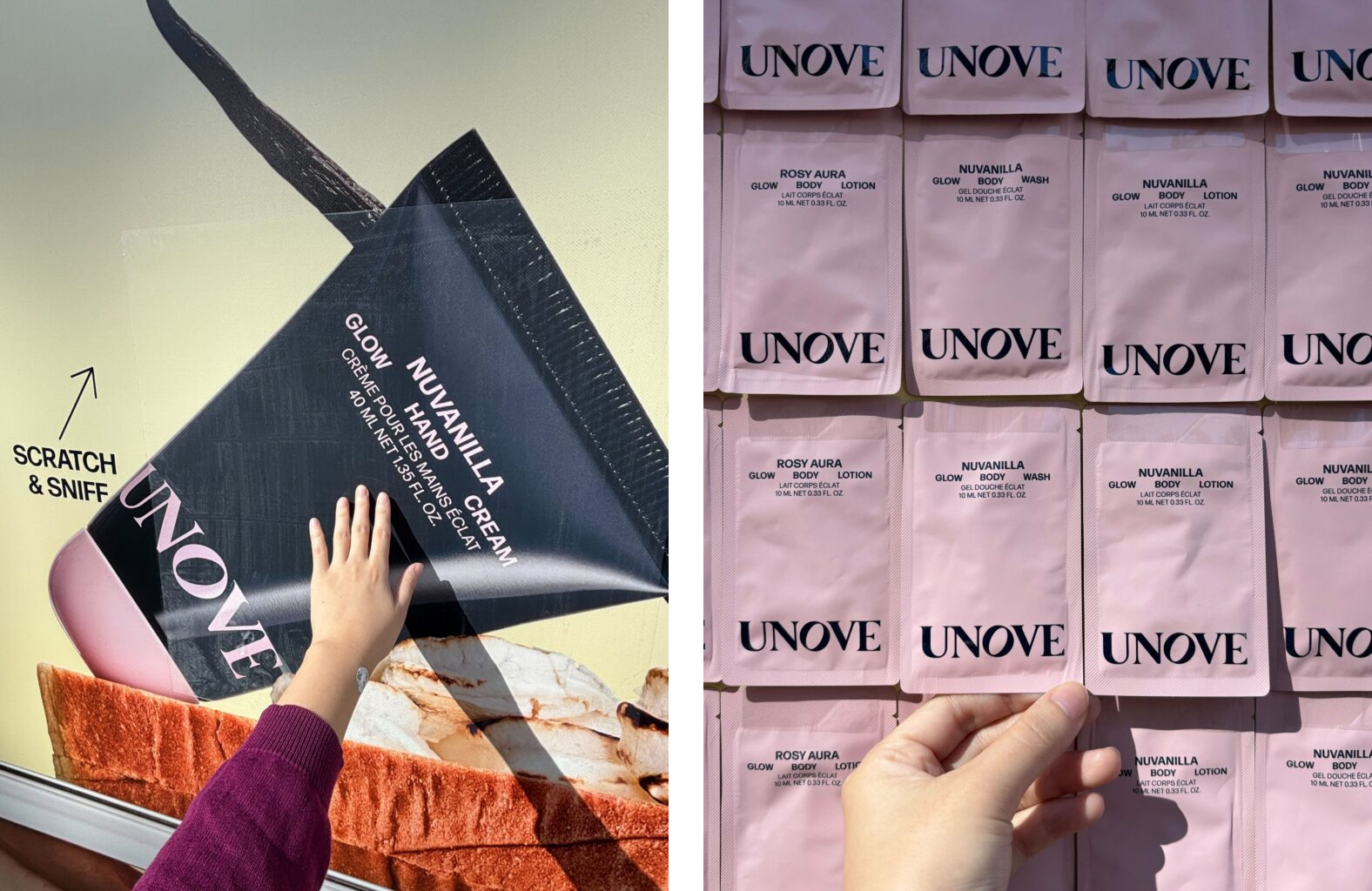 첫 번째 브랜드는 바로 '어노브'가 진행했던 '필 오프 이벤트'에요. 어노브는 지난 10월, 성수 '그레이트월'에 옥외 광고와 팝업스토어를 함께 진행했어요. 벽면에 부착된 샘플을 뜯어내면 그 뒤에 가려졌던 어노브의 메시지를 담은 OOH 광고가 드러나는 방식이었죠. 샘플을 모두 제거하면 벽 자체가 완전한 옥외광고로 재활용되어, 참여형 이벤트와 브랜드 노출 이 동시에 이루어졌어요. 광고판을 스크래치하면 신제품의 향기를 느낄 수 있는 스크래치&스니프 방식(향기 입자를 코팅해 스크래치 시 향기가 나도록 만드는 방식)으로 제작해 샘플을 뜯으면서부터 향을 느낄 수 있도록 기획해 '향으로 기억되는 브랜딩'까지 할 수 있었죠.