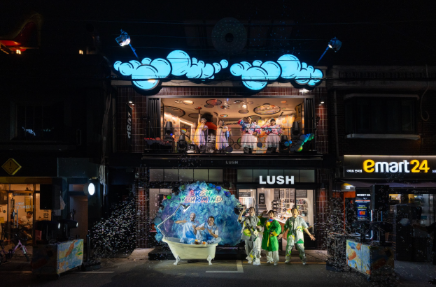 러쉬도 넘치는 팝업스토어의 성지 성수에서 존재감을 드러냈어요. 지난 9월부터 11월까지 '팝업'과 '거리 공연'이 결합된 팝업 씨어터를 선보였는데요. 99번째 오디션에서 떨어진 무명 배우가 욕실에서 실패의 상처를 씻어내고, 100번째 공연을 한다는 내용의 공연이었어요. 올해는 야외 활동이 활발해지며 거 리 문화를 중심으로 하는 마케팅이 인기를 끌었는데요, 러쉬도 이러한 트렌드에 맞춰 야외 공연을 선보여 좋은 반응을 얻었어요. 웨이팅에 지친 성수 방문객들에게 예약 없이 길을 걷다 공연을 볼 수 있다는 점도 굉장한 포인트로 다가갔어요. 공연 중 러쉬의 제품을 사용해 자연스럽게 향을 느낄 수 있게 브랜드를 노출했어요.