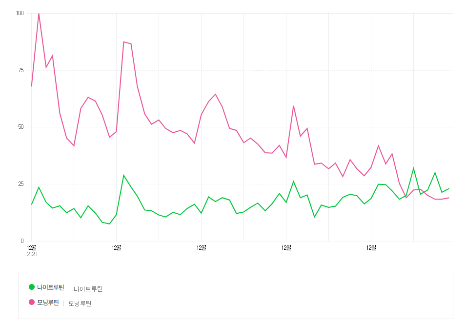 '모닝루틴', '나이트루틴' 검색량 추이 조회기간 내 최다 검색량을 100으로 설정하여 산정 / 소재 출처: 캐릿