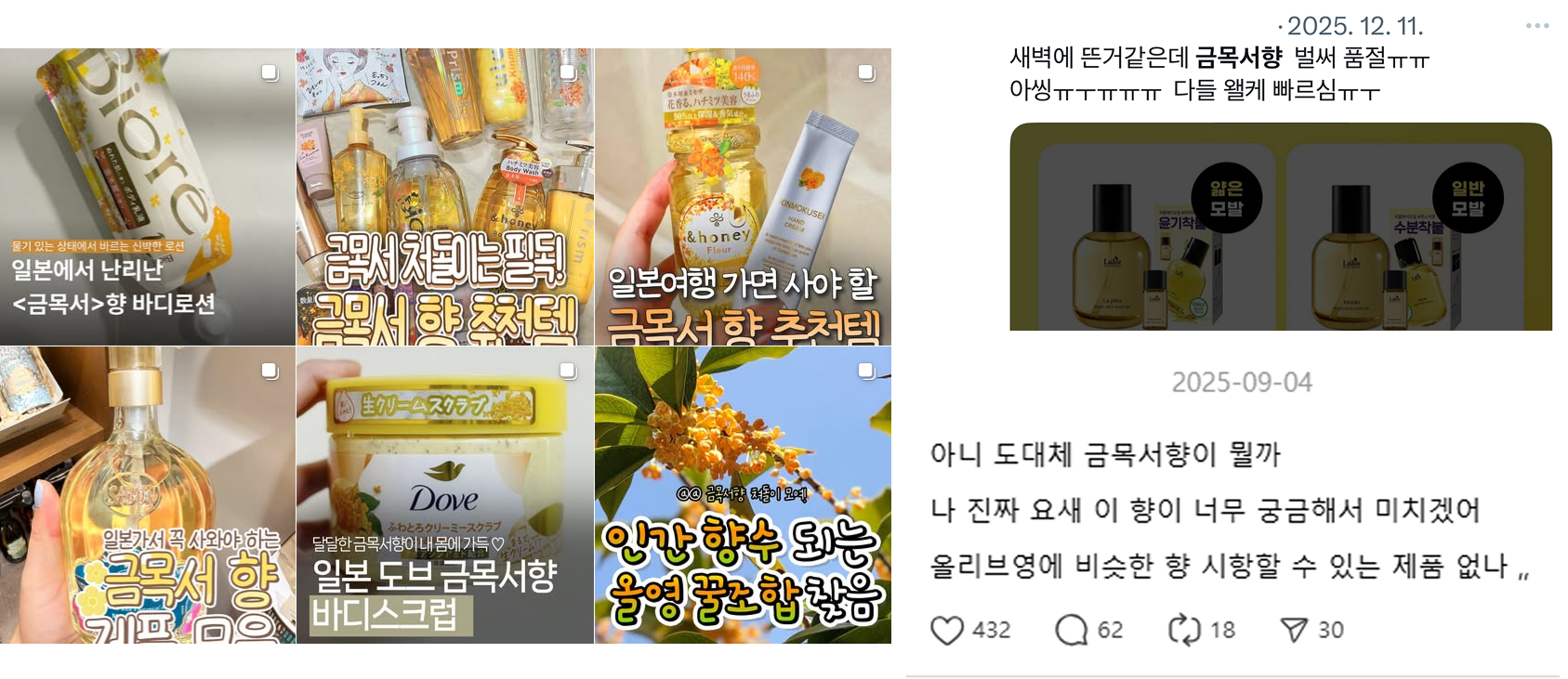 최근 금목서 향이 핫했던거 다들 기억하시죠? 작년 가을부터 일본에서 시작되어 SNS를 통해 한국으로까지 제철 꽃 향인 금목서 향을 이용한 제품이 유행하기 시작했어요. 향수부터 바디 제품, 사탕까지 각종 SNS에 올라오며 인기를 끌었어요.