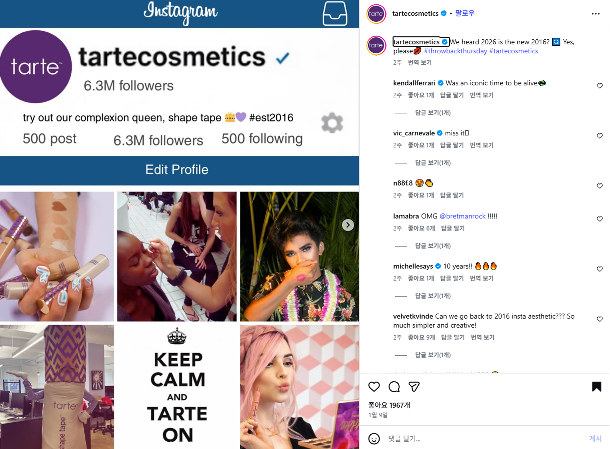 타르트 코스메틱은 2016년도의 브랜드 인스타그램 피드를 보여줌으로서 브랜드의 성장을 직관적으로 보여줬어요. 그 시절부터 지금까지 이어진 브랜드의 시간과 성장을 직관적으로 드러내고 있어요. 그때 감성 비주얼을 소환해 소비자 기억을 건드리는 방식이죠. 익숙한 색감, 필터 무드, 예전 제품 컷까지 더해지니 브랜드에 대한 친밀감도 자연스럽게 올라가고요.