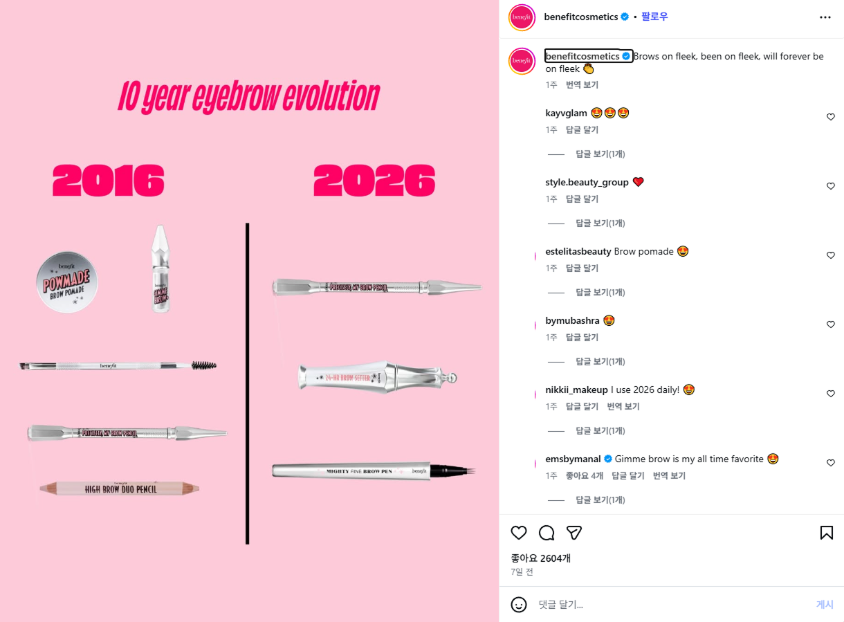 베네피트는 특유의 화려하고 키치한 브랜드 무드는 그대로 유지하면서도, 한층 사용성이 좋아진 제품들을 한눈에 보여주는 방식으로 메시지를 전달했어요.