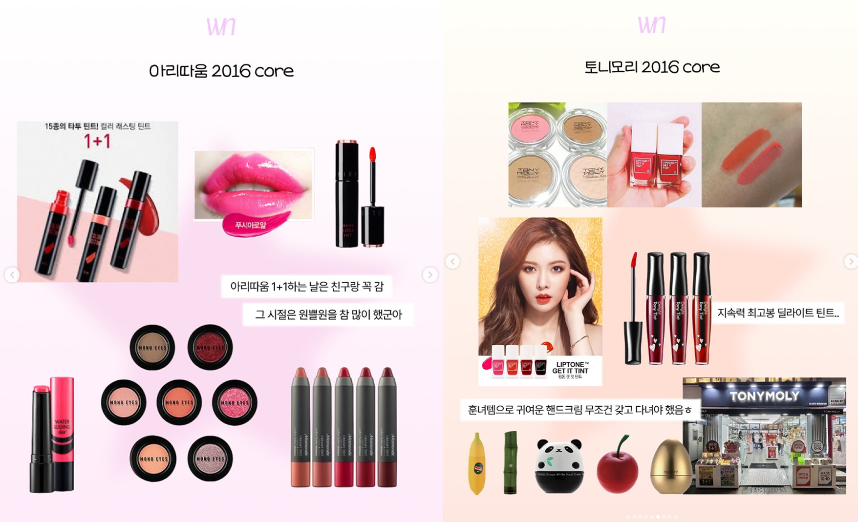 이러한 향수를 불러일으키는 유행은 외국뿐만 아니라, 한국에서도 이어져요. 토니모리 틴트, 스킨푸드 선크림처럼 학창 시절 파우치에 들어 있었던 제품들이 다시 회자되면서, "아리따움 코어", "스킨푸드 코어" 등의 단어가 유행하며 #Backto2016 무드가 뷰티 추억으로 이어지는 중이에요.
