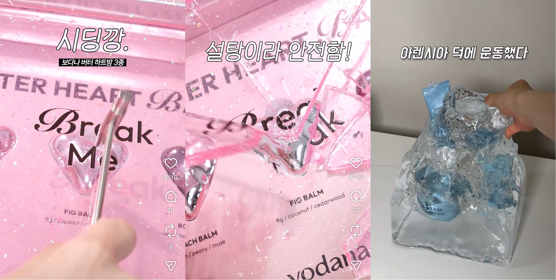 반짝이는 슈가 글래스를 직접 깨면서 부수는 순간 촉감과 소리를 함께 즐길 수 있는 보다나의 버터 하트밤 시딩도 이슈가 되었어요. 크리에이터가 직접 코팅된 설탕을 깨 제품을 꺼내는 방식이 시각적인 임펙트를 자극하고 스트레스가 풀리는 것 같다, 실제 먹을 수 있는 패키징이냐는 등 제품 외에도 시딩 키트 자체에 대해 궁금해 하는 반응이 많아 기억에 남는다는 소비자들도 있었어요.