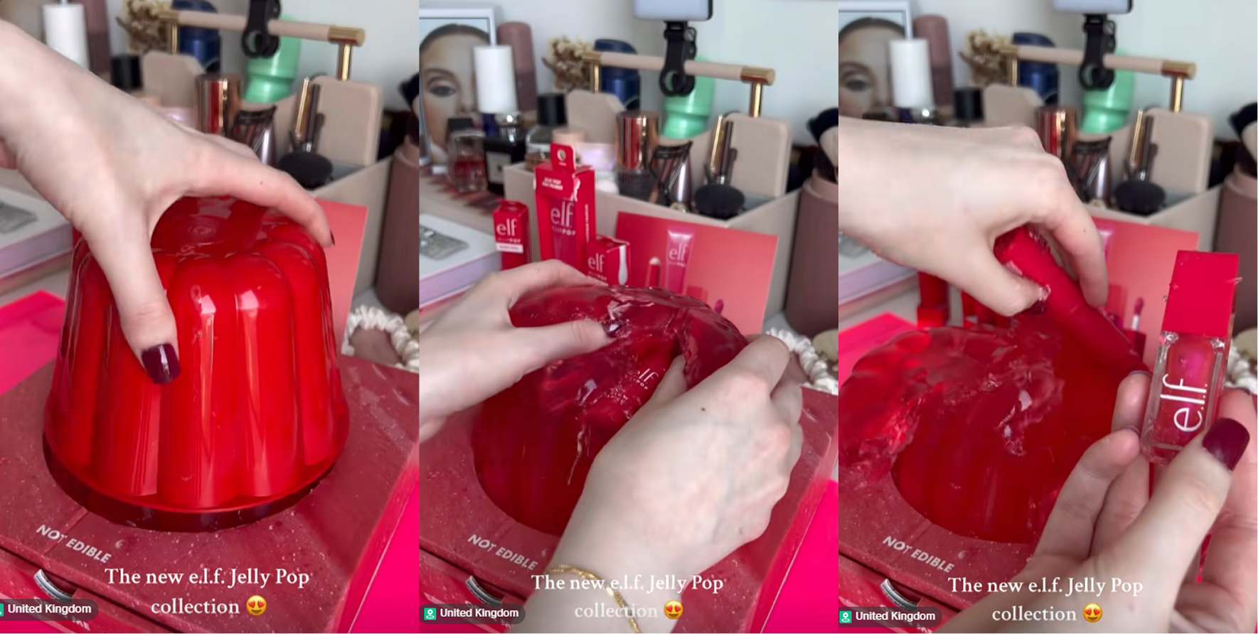 이 밖에도 제품을 공감각적으로 체험하게 하려는 뷰티 브랜드들의 다양한 시도가 이어지고 있어요. 뷰티 브랜드 엘프(e.l.f)는 제품 젤리팝의 홍보 시딩에 실제 젤리 제형의 대형 오브제를 제작해 넣어 보는 사람들로 하여금 실제 젤리의 탱글함이 제품에서까지 느껴질 수 있도록 제작했고요. 패키징이 특이하다, 실제 먹을 수 있는 젤리냐는 등의 반응이 가장 많았어요.
