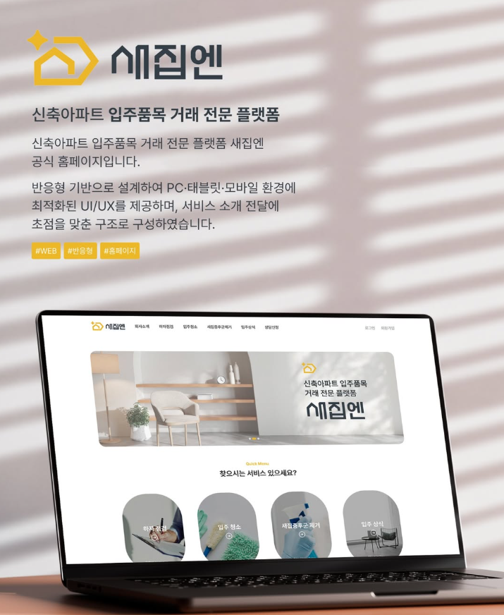 아이블이 새롭게 시작한 서비스! 기획부터 개발, 운영까지 CTO급 파트너가 책임집니다. 신축 아파트의 입주 품목 거래 전문 플랫폼 새집엔의 공식 홈페이지를 제작했어요. 반응형 기반으로, PC/태블릿/모바일 환경 모두에 적합한 UX/UI를 제공하며 서비스 소개 전달에 초점을 맞춰 제작했습니다.