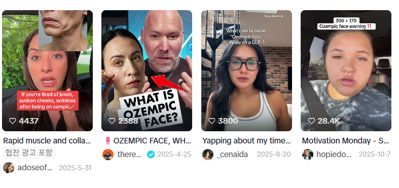 마운자로와 위고비 등 다이어트 주사가 유행하면서, 급격한 체중 감소로 피부 볼륨과 처짐 등의 언급이 확산되며, 이런 피부 변화를 부르는 말인 오젬픽 페이스 (Ozempic Face)라는 단어가 만들어졌어요.