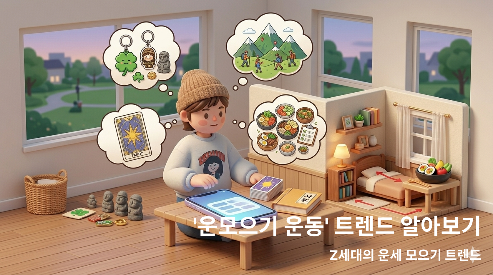 요즘 z세대에게 인기 있는 트렌드는 바로 '운모으기'인데요, 지난 몇 년간 행운은 z세대의 소비자에게 인기 있는 키워드였어요. '럭키비키'나 행운 부적, 클로버 아이템 등 행운 컨셉의 굿즈가 인기였고요. 이제는 단순히 키링 굿즈를 넘어서 사주별 명산을 찾아가고, 풍수지리에 맞게 인테리어를 바꾸고 사주 기반으로 오늘 먹을 것까지 고르는 z세대가 늘었다고 해요.